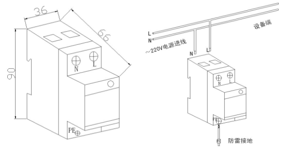 電源相線(L)、零線(N)分別接入電涌保護(hù)器相應(yīng)接線端子,保證牢固及可靠,將避雷器接地端與防雷地線(推薦接地電阻≤4Ω)作良好電氣連接。