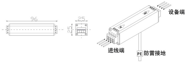 在被保護設(shè)備的線路接口前段串聯(lián)接入避雷器,“OUT”為設(shè)備端、“IN”為進線端,將避雷器接地端與防雷地線(推薦接地電阻≤4Ω)作良好的電氣連接。