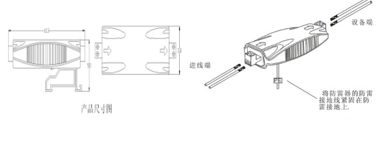 在被保護(hù)設(shè)備的線路接口前端串聯(lián)接入避雷器,“OUT”為設(shè)備端、“IN”為進(jìn)線端,將避雷器接地端與防雷地線(推薦接地電阻≤4Ω)作良好的電氣連接。